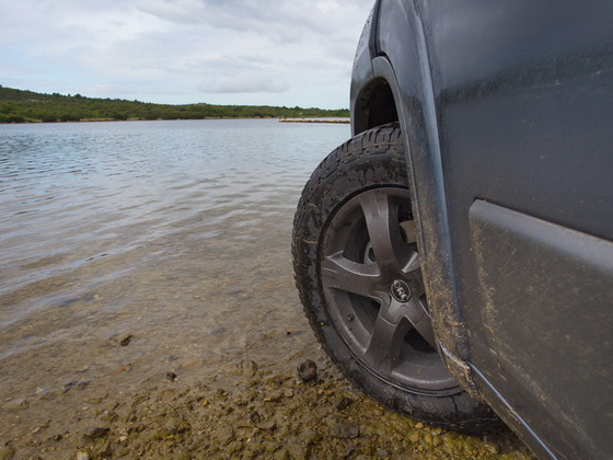 Gummiband über der Ablage der Spüle, damit nichts rausfällt, darunter lange Griffleiste als Trockentuchaufhängung.